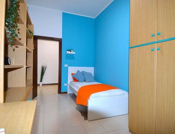 Situated a few steps from the hospital and adjacent to the historic center, in a high-level apartment located on the second floor, specifically renovated to offer comfort and convenience to our students. The room is equipped with a bed, a three-door wardrobe, a desk, a nightstand, curtains, a mirror, a shoe rack, and a bookcase