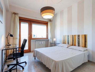 A fully furnished 14 sqm single room for rent, equipped with a bed, desk, and wardrobe, located in a spacious 140 sqm apartment on the 10th floor with elevator, in Via Padre Semeria.