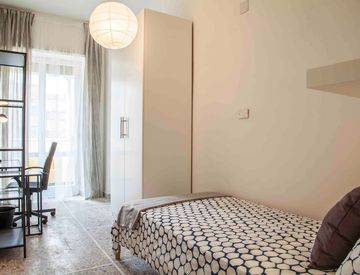 Affittasi stanza singola di circa 9 mq, completamente arredata con letto, scrivania e armadio, situata all’interno di un ampio appartamento di 150 mq al settimo piano con ascensore.