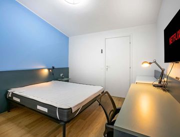 Comfortable 13 m² room, furnished with a double bed (160×190) with memory foam mattress, wardrobe, mini fridge, chest of drawers, desk, and Smart TV. The room is also equipped with a fan (no air conditioning).