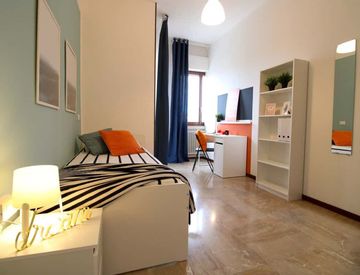 Zona Brescia 2, posizione strategica e ambita, si affitta una bellissima stanza singola con balcone rimodernata appositamente per offrire comfort e comodità ai nostri studenti. La stanza è dotata di letto singolo, armadio, scrivania, comodino, tendaggi, specchio, scarpiera.
