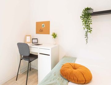 De unos 11 m2 con una cama y media y un puesto de trabajo. Con wi-fi, estacionamiento de bicicletas, lavavajillas, lavadora.