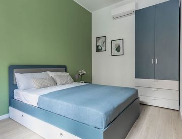 La camera accoglie un letto francese con cassettone ed è grande e ben fornita per studenti universitari o giovani lavoratori. Vi sono una scrivania, un comodino con lampada, un armadio con cassettiera ed una grande finestra che genera luce naturale nella stanza.