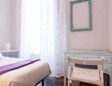 The common spaces include a big and lightly kitchen/living room, a fully furnished kitchen, two bathroom and a small garden. The apartment is equipped with washing machine, refrigerator, oven, microwave, vacuum cleaner