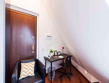 Stanza di circa 13 mq con un letto singolo e una scrivania. Con wifi, aria condizionata, lavastoviglie, lavatrice.
