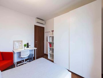 Stanza di circa 15 mq con un letto a una piazza e mezza e una scrivania. Con wifi, aria condizionata, lavastoviglie, lavatrice.