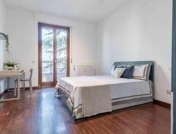 Questa luminosa e spaziosa camera ospita un letto francese con cassettoni, una scrivania, comodini con lampada, un armadio ed un grande balcone. Ottima soluzione per studenti universitari internazionali e giovani lavoratori!