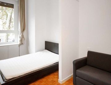 De unos 23 m2 con una cama y media y un puesto de trabajo. Con wi-fi, servicios de conserjería, lavavajillas, lavadora.