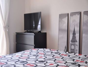Of about 15 sqm with a one and a half bed and a work station. With wifi, concierge services, dishwasher, washing machine.