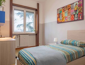 In an apartment located in via Rho 8, this private room is reserved for university students, interns or young workers. Fully furnished, it is equipped with single bed, bedside table with lamp, wardrobe, bookcase, desk and chair.