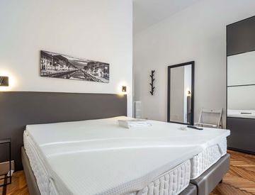 The room consists of double bed 160x200 with 26 cm mattress, wardrobe closet, large mirror, desk and various amenities such as air conditioning system and smart Tv 43" 4K.