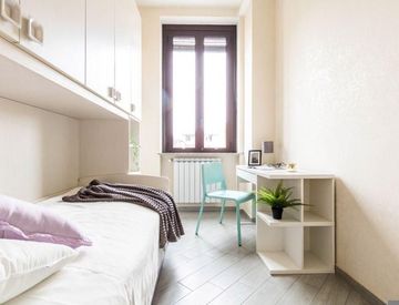 La camera ospita un mobile con armadio e due letti, di cui uno estraibile, una scrivania con lampada e scaffali multiuso. La stanza è ben illuminata e la disposizione dei mobili è tale da ottimizarne lo spazio nel miglior modo possibile. È una soluzione ottima per giovani lavoratori o studenti universitari.