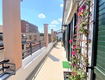 Appartamento arredato, doppia esposizione Nord-Sud, 3° ed ultimo piano con ascensore composto da: soggiorno doppio, ampio terrazzo perimetrale, cucina abitabile, lungo corridoio di disimpegno, 5 camere da letto, 3 bagni e 3 balconi.