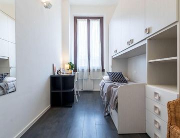 La camera ospita un mobile con armadio e due letti, di cui uno estraibile, una scrivania con lampada e scaffali multiuso. La stanza è ben illuminata e la disposizione dei mobili è tale da ottimizarne lo spazio nel miglior modo possibile. È una soluzione ottima per giovani lavoratori o studenti universitari.
