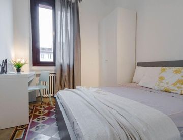 Incredible single room in Milan, boasting a large window that fills the space with natural light. The room is furnished with a double bed, a bedside table, and a desk with a lamp. It also includes a double wardrobe with internal drawers. An ideal choice for international students and young professionals!