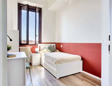 La camera ospita letto singolo, cabina armadio, una scrivania con lampada e scaffali multiuso. La stanza è ben illuminata e la disposizione dei mobili è tale da ottimizarne lo spazio nel miglior modo possibile. È una soluzione ottima per giovani lavoratori o studenti universitari.