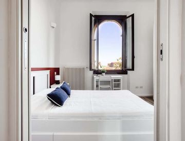 La stanza ospita un letto francese con cassettoni ed un grande armadio. A rendere confortevole e luminoso lo spazio è la presenza di una finestra, di cui poterne godere soprattutto nelle giornate primaverili ed estive. Vi è, inoltre, anche una scrivania con scaffali multiuso e lampada. Soluzione ideale per studenti universitari e giovani lavoratori.