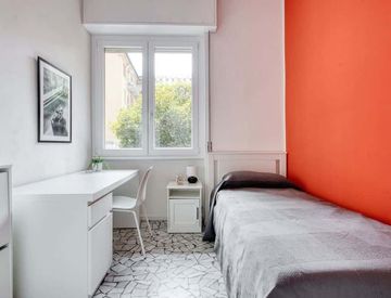 La camera accoglie un letto singolo ed è grande e ben fornita per studenti universitari o giovani lavoratori. Vi sono una scrivania, un comodino con lampada, un armadio con cassettiera ed una grande finestra che genera luce naturale nella stanza.