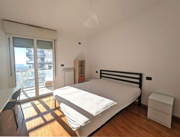 Comoda stanza matrimoniale di 15 mq con balcone, arredata con letto matrimoniale e materasso, cassettiere, scrivania e armadio all’interno di un appartamento di circa 115 mq composto da tre camere da letto, soggiorno, cucina, due bagni e ampio terrazzo. L’appartamento è posto al 5° piano di un bel complesso residenziale di recente costruzione in via Gassman 3.