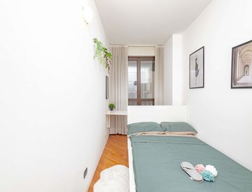 Cozy room with parquet, a bed, small desk, and a window, perfect for a practical and comfortable environment. Shared bathroom.