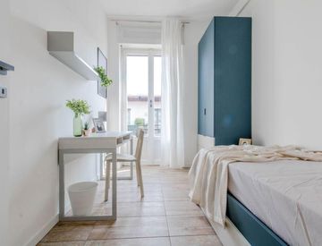 Questa luminosa e spaziosa camera ospita un letto singolo con cassettoni, una scrivania ed un comodino con lampada, un armadio a doppia anta con cassettiera ed un grande balcone. Ottima soluzione per studenti universitari internazionali e giovani lavoratori!