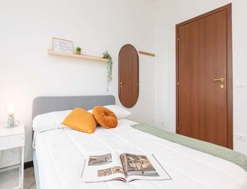 Stanza di circa 14 mq con un letto a una piazza e mezza e una scrivania. Con wifi, servizio portineria, lavastoviglie, lavatrice.