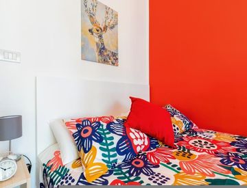 Questa stanza misura 21,74 metri quadrati e dispone di un balcone privato, ideale per gustare il tuo caffè del mattino. L'edificio offre una gamma di servizi tra cui lavastoviglie, lavatrice, parcheggio per biciclette, televisione, WiFi, forno, riscaldamento e microonde. Con un totale di 4 bagni e 9 stanze, avrai ampio spazio per rilassarti.