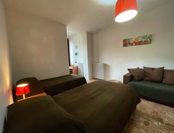 Spacious, bright and comfortable room, composed of a bed, a big wardrobe, big bookshelf, a desk and chair.