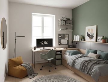 Mobili: letto singolo con comodino, scrivania studio con sedia ergonomica, armadio spazioso, libreria