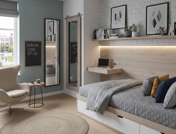 Mobili: letto singolo con comodino, scrivania studio con sedia ergonomica, armadio spazioso, libreria
