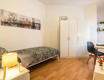 The apartment has just been renovated and consists of 6 comfortable Single Rooms, 2 Bathrooms with Shower, and a very large fully equipped Kitchen. The furnishings are in a Modern Minimal style, and every room is studied in detail.