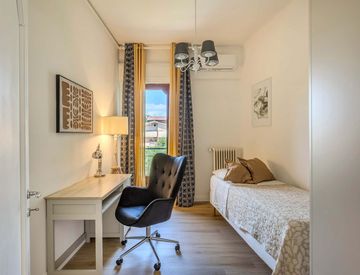 Single room with a single bed featuring a high-quality memory foam mattress, pillow, bed linen, a wardrobe, a private balcony, and a desk. The rent for the single room is 550 euros. Each room is equipped with its own heating system and air conditioning.