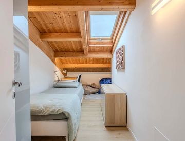 Le stanze sono complete di un letto con un armadio a due ante con cassettiera, scrivania con poltrona ergonomica professionale, letto con materasso e cuscino in memory foam e serratura con chiave.