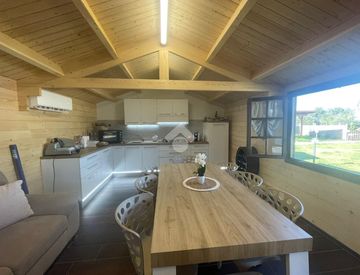 Sul terreno sono presenti varie casette prefabbricate in legno (di cui una con angolo cottura, stufa e condizionatore ed una con bagno interno), tettoia con fornoa legna e barbecue e piscina fuori terra. Allacci già presenti, telecamere e impianto di illuminazione interno ed esterno.