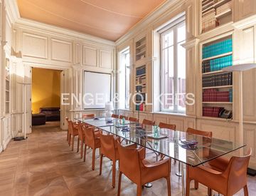 L’ingresso dalla scala principale, i soffitti a cassettoni, i parquet originali e la terrazza rendono questa soluzione particolarmente adatta a ospitare uno studio professionale o la sede di una società di rappresentanza. L’ufficio è cablato e dotato di sistema di controllo degli accessi. Non è consentito l’uso ricettivo.