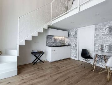 Composizione: Zona giorno con cucina a vista Bagno con doccia rifinita in marmo Calacatta Angolo lavanderia Soppalco con letto matrimoniale e armadi su misura Rifinito con carta da parati Fornasetti, dotato di climatizzatore, impianto d’allarme, e venduto completamente arredato e corredato.