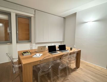 Disposto su 110 mq, l'ufficio si compone di: ingresso con reception/attesa, tre uffici di cui uno adibito a sala riunioni, archivio, antibagno, bagno e ripostiglio.