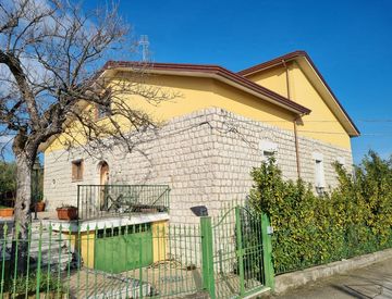 Montemiletto. Via Caponi. Non lontana dal centro, in contesto residenziale, villetta indipendente realizzata negli anni 2000, in parte con facciate in pietra.