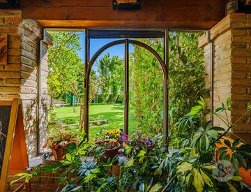 -Veranda in ferro completamente vetrata con affaccio sul giardino, creazione unica del maestro fabbro Luigi Damiani;