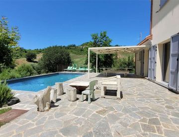 Una bellissima piscina di 8 mt per 4, fa parte della corte ed è direttamente collegata con il grande salone della casa completo di camino.