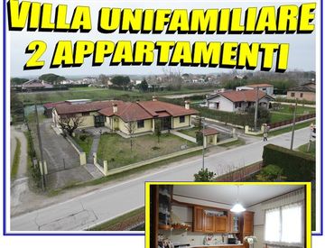 In Monticelli di Mesola (FE), villa unifamiliare tutta al piano terra con grande giardino recintato e piantumato, composta da due unità abititive, ideale per due nuclei familiari, composta da: ingresso carraio ed ingresso pedonale, porticato, due cucine, due bagni, quattro camere letto, soggiorno, lavanderia, garage, magazzino con bagno, deposito esterno. Impianto di riscaldamento con termosifoni, parzialmente arredata.