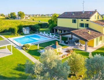 Le tende da sole della zona esterna nel portico sono motorizzate e il giardino è di circa 3000mq tutto piantumato con alberi e cespugli. La piscina di 10 per 10 è composta da una parte prendisole.