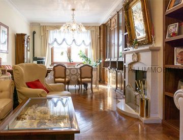 La ristrutturazione radicale è stata eseguita con materiali di pregio quali parquet a listoni con intarsi, serramenti artigianali, eleganti porte in legno massello con cornici, dettagli in marmo e mattoni a vista. Completano le finiture eleganti e raffinate boiserie in massello con vetri decorati.