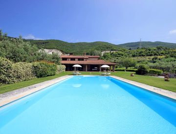 Veranda attrezzata, terreno di 5.000 mq con ulivi e alberi da frutto, 1.000 mq di prato inglese e piscina 14x7 m.