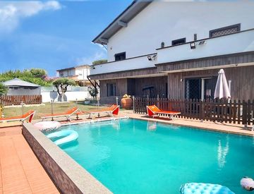 VILLA UNIFAMILIARE adiacente Axa quartiere residenzial, 520mq e 900 mq di Giardini e Corti esterne su 4 lati, con Piscina riscaldata e idromassaggio. Rifiniture di pregio, divisibile in 3 unità immobiliari.