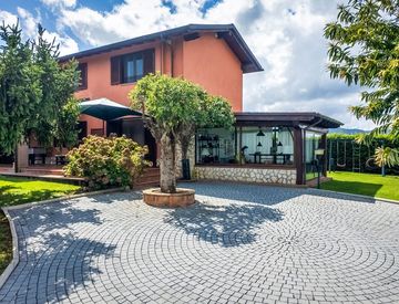 Varcando il cancello d’ingresso, si viene accolti da uno splendido viale mattonato, contornato da splendide aree verdi, che ci conducono all’ ingresso dell’abitazione. Qui, gli spazi esterni si aprono in un ampio ed elegante portico in legno di 40 mq, perfetto per accogliere gli ospiti o godersi momenti di relax e convivialità, sia d’estate che nelle mezze stagioni.