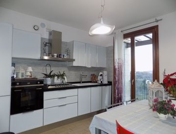 Una spaziosa cucina abitabile, ideale per chi ama cucinare in un ambiente funzionale e ben organizzato con accesso al terrazzo con vista panoramica.