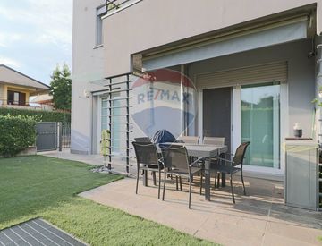 l'ingresso pedonale indipendente ci presenta all'apertura il giardino privato di 75 mq. distribuito su 3 lati, con una zona piastrellata per godersi momenti di relax all'aperto.