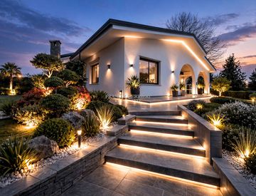 L’abitazione è circondata da un giardino rigoglioso e ben curato, il particolare tetto estende il porticato e invita alla discesa in piscina con il bel solarium.
