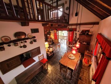 Tranquillissima zona residenziale a fondo chiuso, immersa nel verde, caratteristica VILLA SINGOLA composta al piano terra da; salone con camino, FANTASTICO PORTICATO ABITABILE, cucina separata, due camerette e bagno; piano primo; zona relax aperta sul salone, due camere, bagno ed un terrazzo. GIARDINO PIANTUMATO di mq 1.200 con posti auto interni. Le travi in legno a vista, le GRANDI APERTURE ed i mobili in stile montano caratterizzano questa interessante...